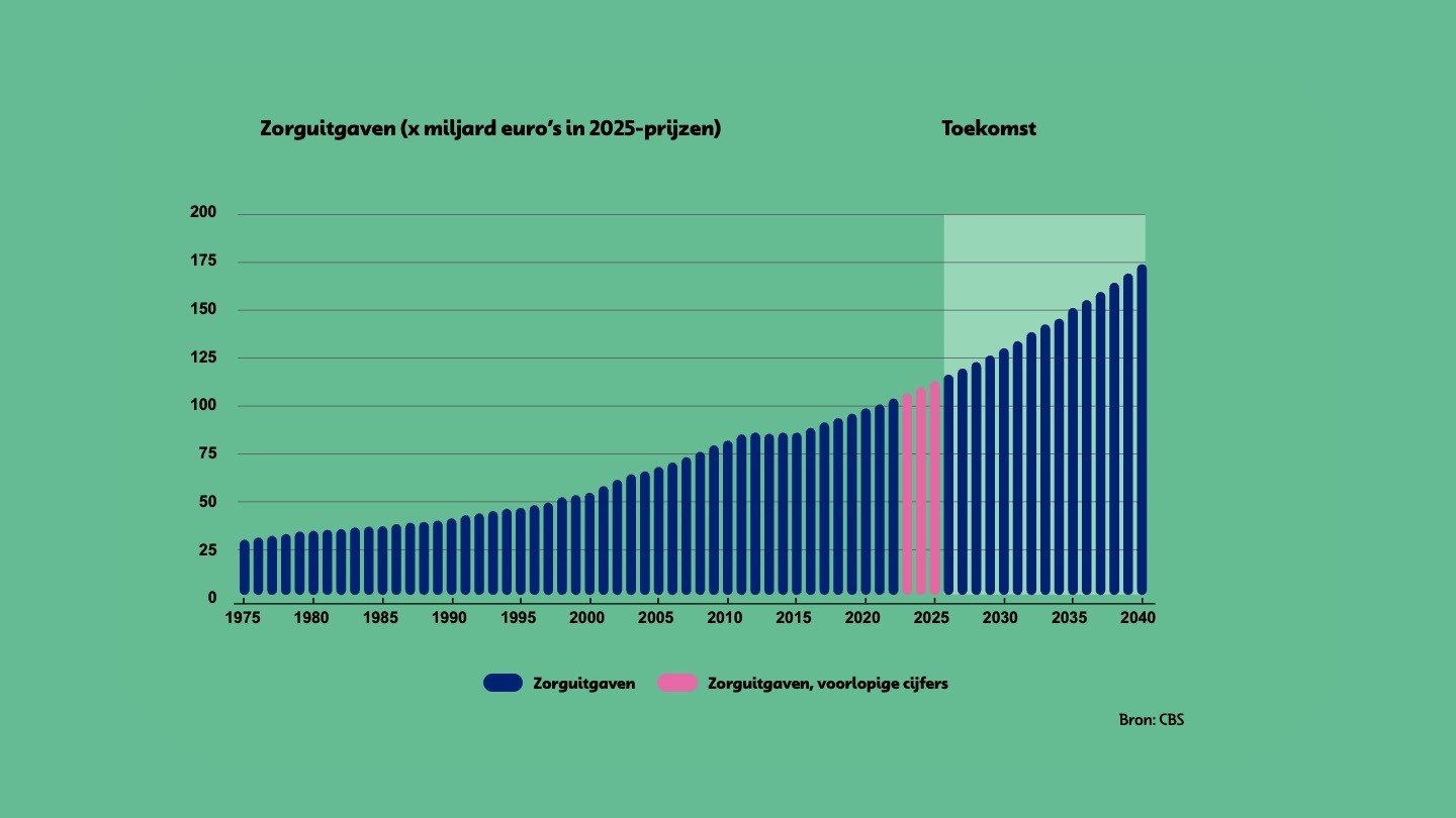 De zorguitgaven zullen stijgen van 100 miljard euro nu, naar 180 miljard euro in 2040. Dat is onmogelijk met de bestaande processen. Om de zorg goed, betaalbaar en voor iedereen toegankelijk te laten blijven, is een andere aanpak nodig.